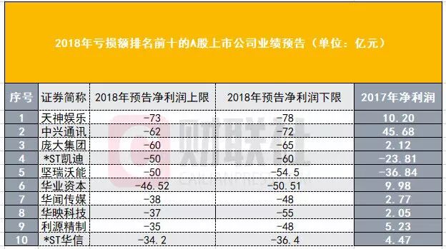 截至1月31日,最新发布的业绩预告公司为科隆股份,公司预计2018年亏损9200万—9700万,上年同期为盈利2281.33万。据Wind数据显示,目前发布业绩预告的上市公司中,有383家出现了业绩亏损,亏损额为2823.88亿—3287.01亿,亏损中位数为3055.44亿;而上年同期,这383家上市公司的净利润为亏损431.13亿,按此计算(亏损中位数),2018年383家上市公司亏损同比扩大了6.08倍。其中,多家上市公司的亏损额已超过市值。(财联社)