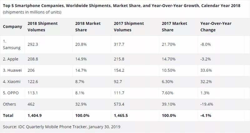 18、IDC四季度手机报告:华为排全球第三,小米几无增长