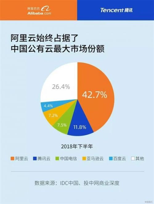 从目前的市场份额来看,腾讯的云计算远不及阿里巴巴的。根据国际咨询公司IDG数据显示,2018年下半年中国公有云计算市场中,阿里巴巴的云业务占据了42.7%的市场份额,而腾讯云仅为11.8%