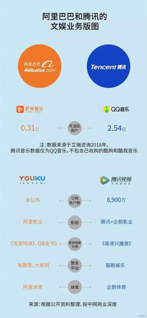 《每日经济新闻》报道称,腾讯和阿里文娱版图自成体系,但双方又各有重心。其中腾讯重IP,通过IP的运营从而向下游的内容和游戏影业变现拓展;而阿里巴巴则重流量分发,探索出了以内容分发和衍生品销售为依托的泛娱乐模式。
