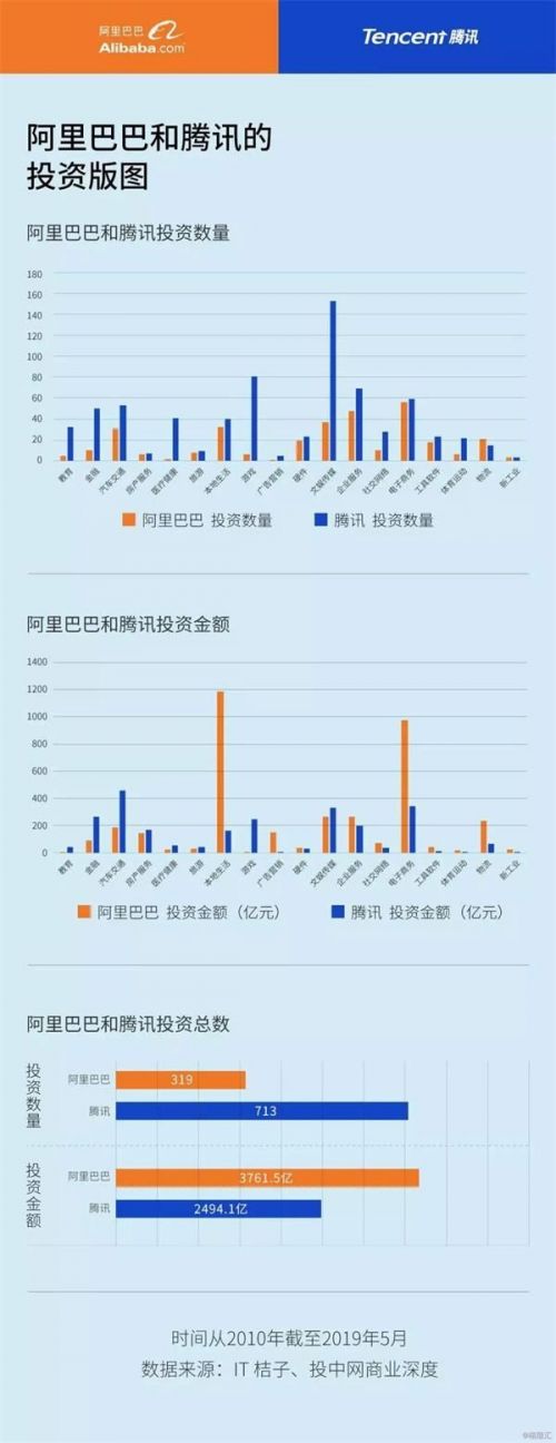 从2010年开始截至2019年5月,腾讯一共投资713次,阿里319次,腾讯投资次数是阿里投资次数的逾2倍;但阿里投资金额高达3761.5亿元,腾讯投资金额2494.1亿元,阿里投资金额是腾讯投资金额的1.5倍。以此计算,阿里投资项目的平均高达11.7亿元,腾讯则是3.4亿元。