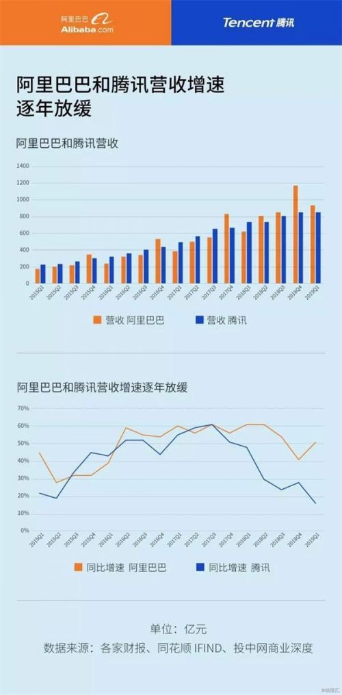 但实际上,从2017年三季度开始,这两家公司的营收增速开始趋势放缓。根据财报显示,在2017年三季度,阿里巴巴和腾讯营收分别达551.2亿元和652.1亿元,增速同为61%,之后再也没有超过这一增速。尤其腾讯已经跌入50%以下,在今年一季度跌至16%。