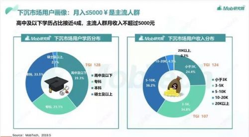 《2019 年下沉市场图鉴》的数据显示,在下沉市场,月收入 3K 以上的用户(双职工家庭则月收入 6K 以上)占据 75.6%,月收入 5K 以上的用户(双职工家庭月收入1W 以上)占据 40.8%。