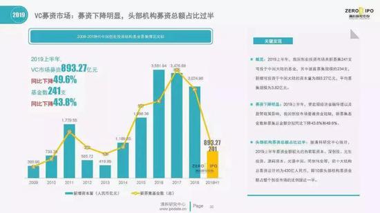 这一切,从VC机构募资就看出端倪。清科研究中心数据显示,2019上半年VC市场募资893.27亿元,同比下降49.6%,堪称腰斩;