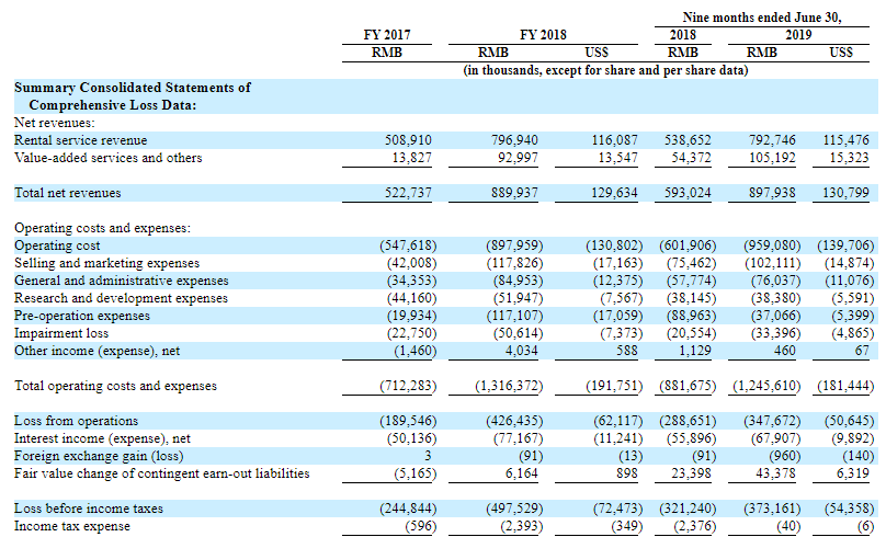 招股书显示,青客公寓从2017年的5.22亿元增长到2018年的8.89亿元,同比增长70.3%;截至2019年6月30日的前9个月,营收为8.98亿。但是,在2017年、2018年,青客的净亏损分别达2.45亿元和4.98亿元。