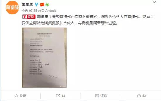 之后不到一天,淘集集更换了置顶,表示主要经营模式由商家入驻模式,调整为合伙人自营模式。