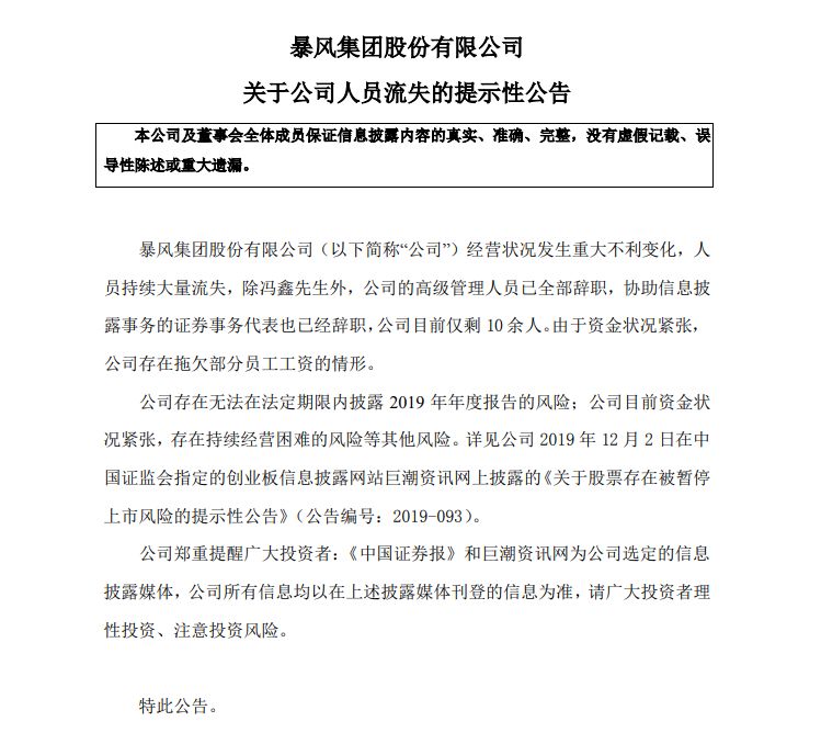 12月2日,暴风集团股份有限公司发布关于公司人员流失的提示性公告称,暴风集团股份有限公司经营状况发生重大不利变化,人员持续大量流失,除冯鑫先生外,公司的高级管理人员已全部辞职,公司目前仅剩10余人。由于资金状况紧张,公司存在拖欠部分员工工资的情形。