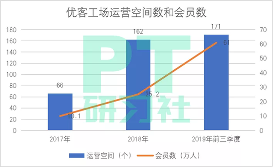 从会员数量上来看,优客工场的会员增速着实迅猛。2018年,优客工场的会员数仅25.2万人,到了2019年会员数就增至61万人。三个季度的时间,优客工场的会员数增长了36万人。