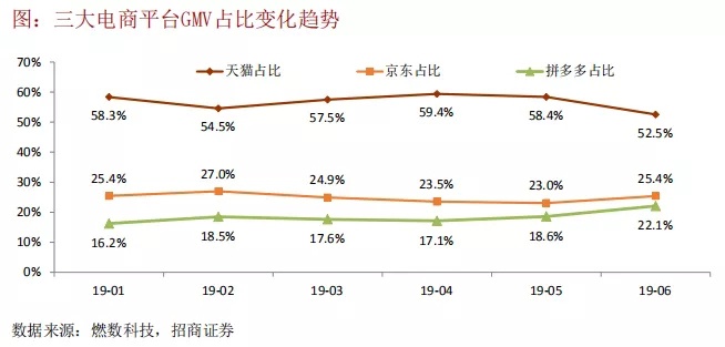 与之相反的是,以拼多多为代表的主打下沉市场的电商平台,GMV占比一路水涨船高。据燃数科技显示,拼多多在主要电商平台的GMV占比从2019年1月的16.2%增长到2019年6月的22.1%,GMV增速明显超过天猫及京东。下沉市场逐渐开始显示出其巨大的潜力。
