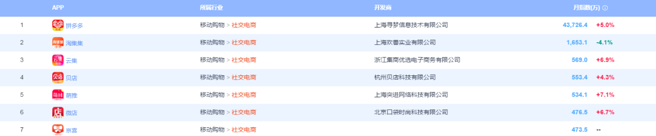 云集虽然月活数据排在第三,但到第七名的京喜为止,企业之间的差距不算很大,就月指数增幅来说,云集也并未明显突出。