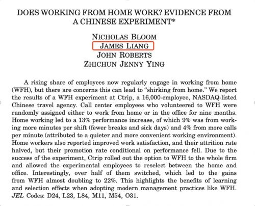 他们还在美国经济学顶尖杂志《经济学季刊》(The Quarterly Journal of Economics)上发表了一篇名为《在家办公的可行性:基于中国的实验证据》的论文,向我们展示了研究成果。