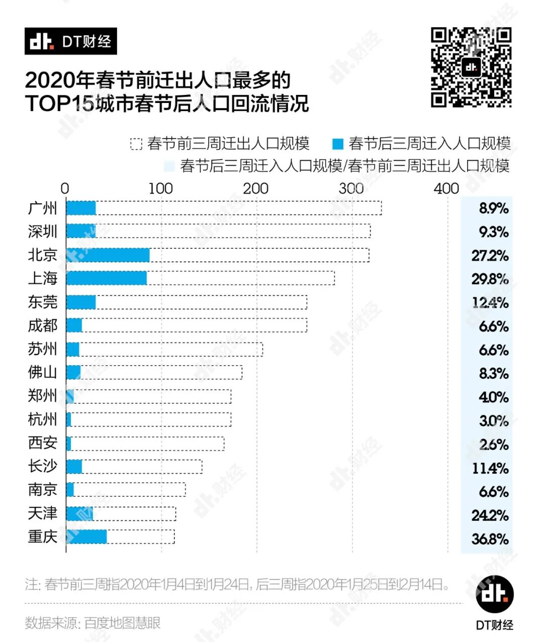 从城市来看,在春节前三周迁出人口最多的15个城市中,重庆、上海、北京和天津在春节后的人口回流比例相对较高,而西安、杭州、郑州、南京、苏州、成都等地都十分惨淡。