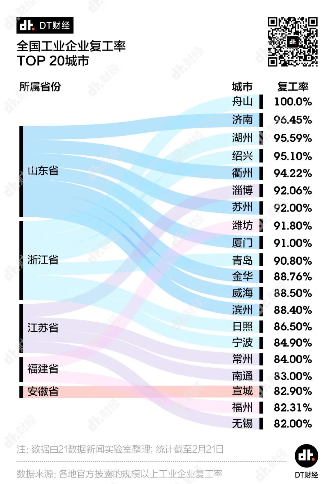 据21财经统计,截至2月21日,全国规模以上工业企业复工率前列的省份有山东(复工率79.40%)、福建(75.8%)、江苏(75%)、浙江(72.20%)、辽宁(71.30%)。广东复工率较低,略大于50%。
