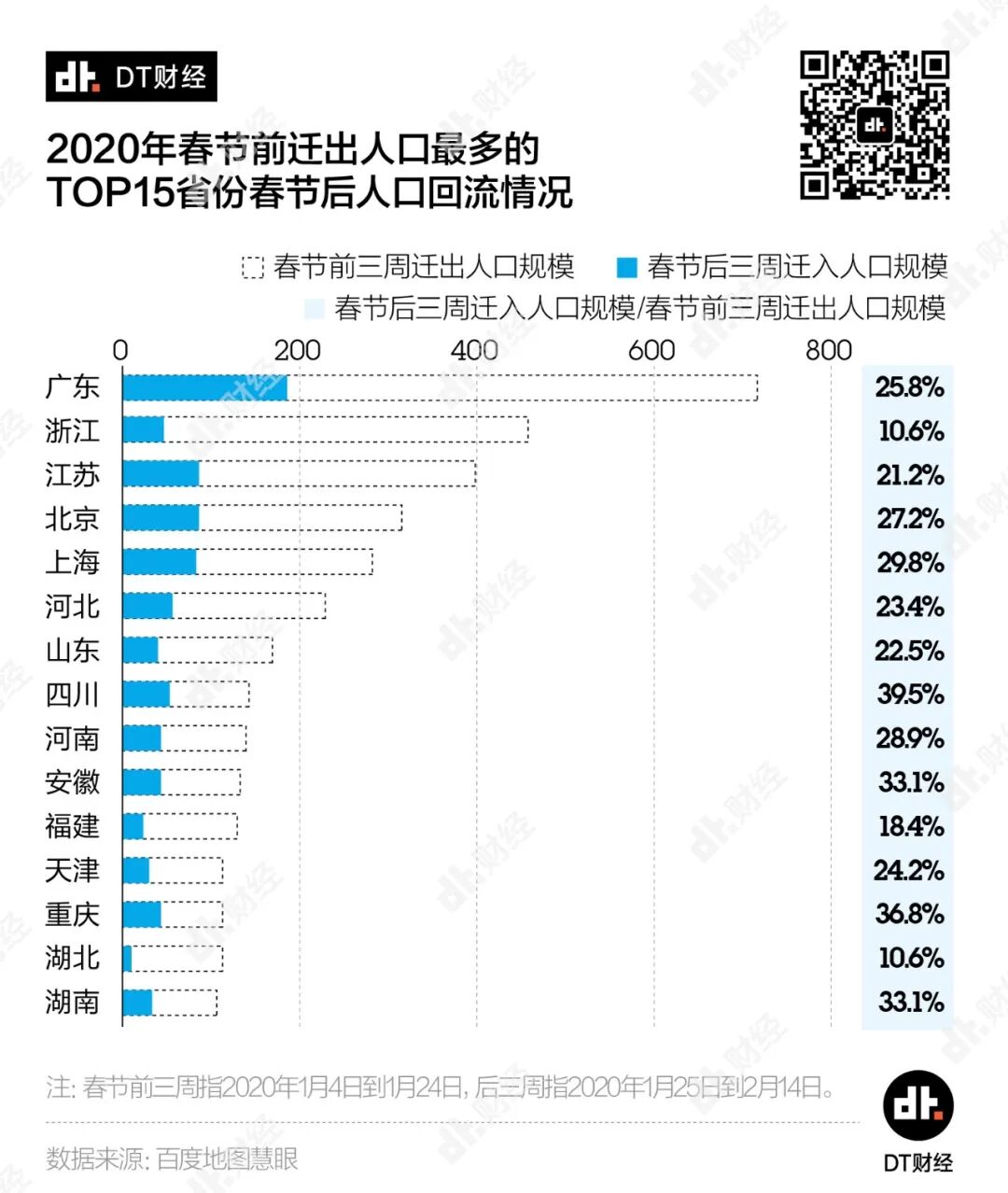 结果显示,在春节前三周迁出人口最多的15个省市中, 四川、重庆、安徽、湖南等地的人口回流比例相对较高;但浙江远低于平均水平,福建和江苏情况稍好一些,不过人口回流比例也并不高。