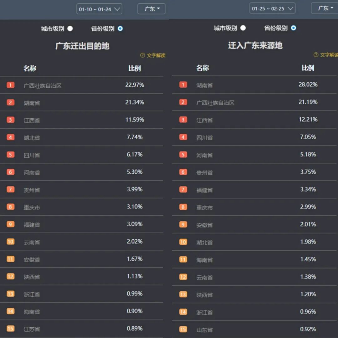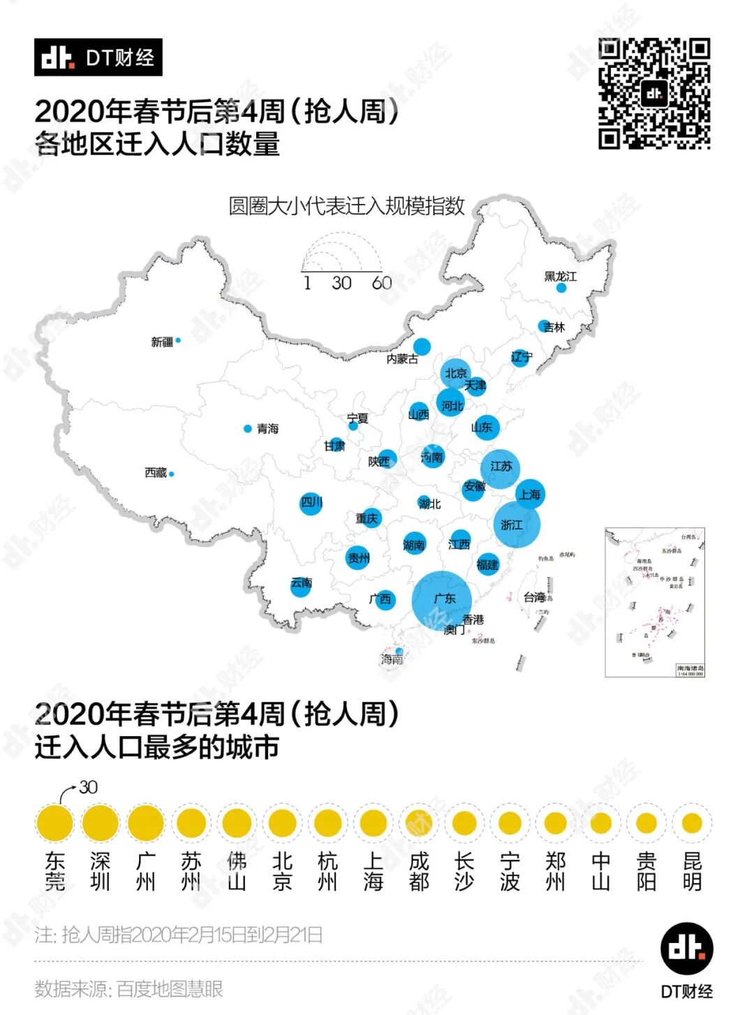 如果说浙江是抢人工作进步最大的省,那么广东就一直站在抢人排行榜的顶端——在浙江向热门迁入地一步步攀爬的这些天,广东稳居热门第1的位置,岿然不动。 我们特别统计了春节后第四周(2月15日-2月21日)各省市迁入人口的规模,在抢人周迁入人口数量最多的5座城市中,有4座来自广东。