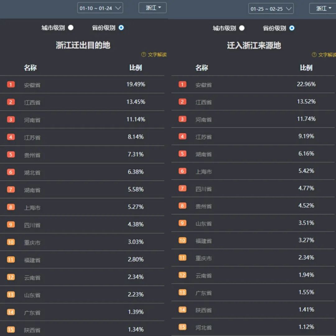 百度迁徙数据显示,浙江省在2月9日的全国热门迁入目的地排名中还只处于第18位,之后的每一天,其排名都在上升,到了2月18日,浙江已经是全国第2热门的迁入地了。