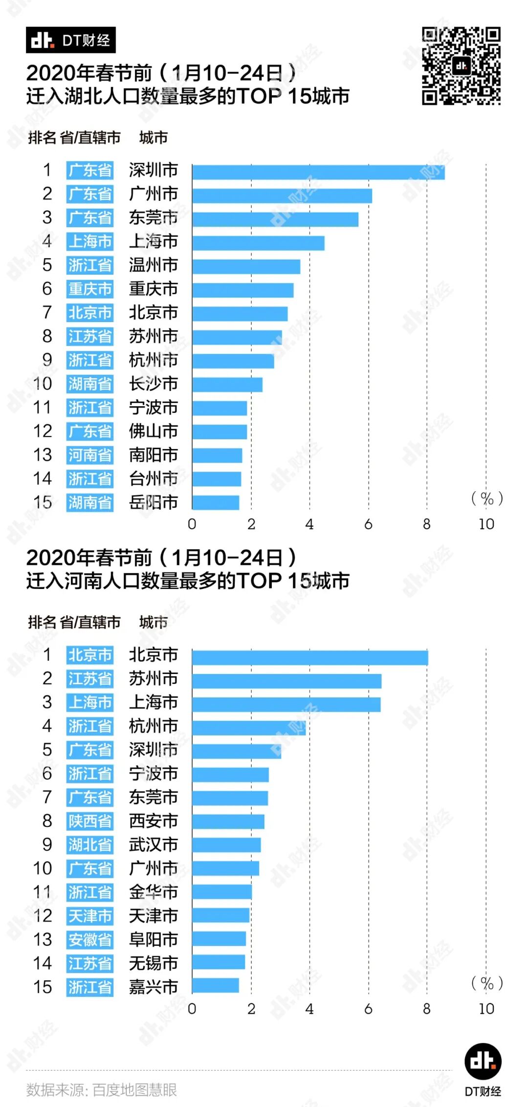 这两个大省人口流出不同程度受阻,哪些城市受影响最大? 从百度的数据可以看到,春节前两周,回到湖北的人口最多来自于深圳、广州和东莞,合计占湖北迁入人口的20%以上;可以理解为,湖北对外输出的人口中,最多地去了这3座城市。 而春节前两周回到河南的人口最多来自北京、上海和苏州。