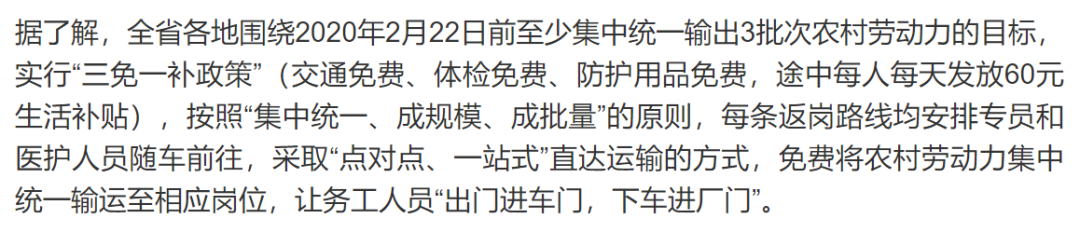 除了我们开头提到的来自长三角的努力,成都、佛山、江门等地相继取消复工审批程序;广东已开展点对点专车服务近200班次,为300多家重点企业有组织输送到岗6108名员工……各种招式层出不穷。