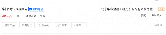 通过在某招聘网站搜索“在线教育”相关职位,锌刻度发现了当前与之相关的企业五花八门。除教育咨询、教育科技公司外,离谱的是工程造价咨询类公司也在发布1对1课程顾问的招聘信息。