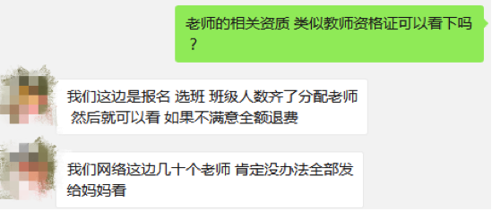 言下之意,家长只有在付款之后才能看到给孩子授课老师的相关资质。