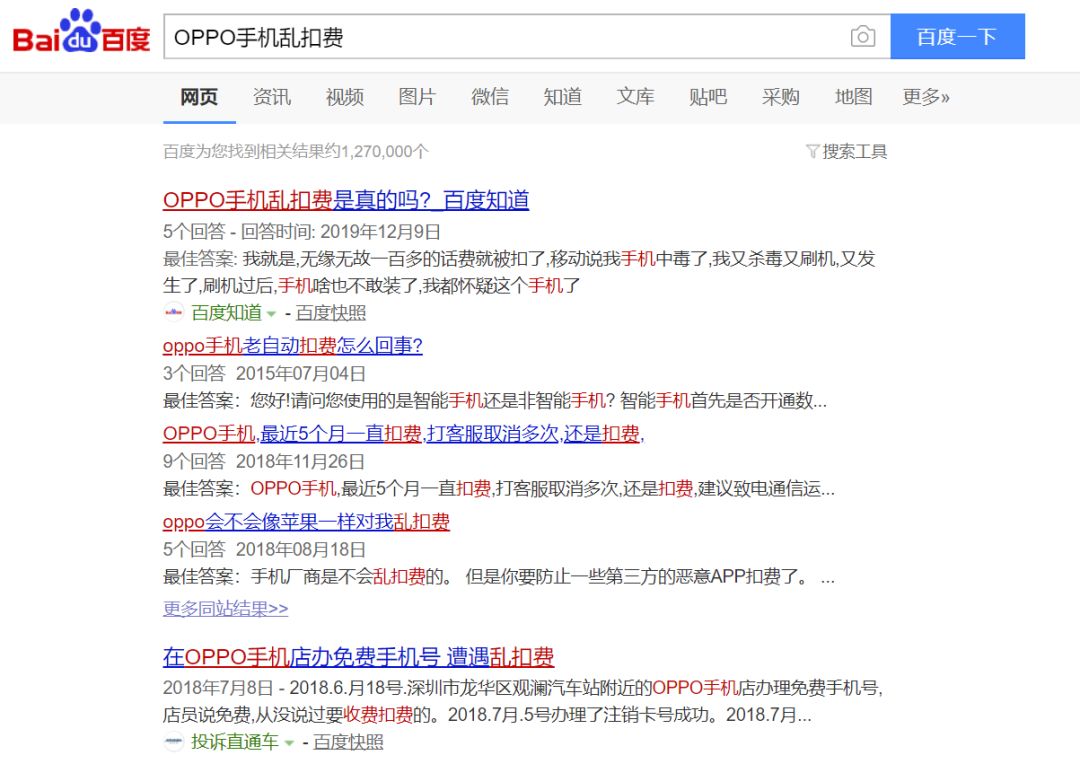 如果你在百度搜索“OPPO手机乱扣费”,你将进入一个“新世界”——有127万条搜索结果,网页显示都排在十几页开外。