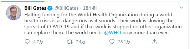 当地时间4月14日,美国总统特朗普在白宫记者会上宣布,美国将暂停资助世界卫生组织。对此,微软公司创始人比尔·盖茨在其社交账号上表态,这种做法很危险。