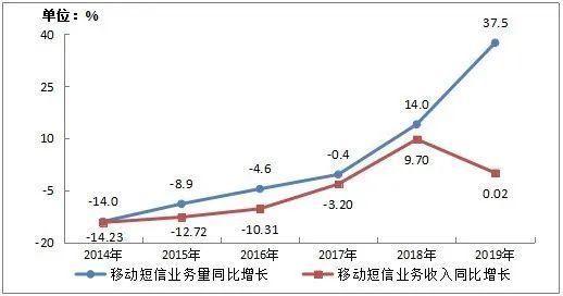 根据工信部公布的数据,由于网络登录和用户身份认证等安全相关服务不断渗透,大幅提升了2019年的移动短信业务量。2019年全国移动短信业务量比上年增长37.5%,增速较上年提高23.5个百分点;但移动短信业务收入完成392亿元,与上年持平。而今年一季度,在移动短信业务量快速增长的同时,收入却又出现下降。