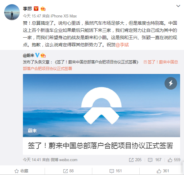 4月29日,蔚来中国获得70亿元战略投资。理想汽车CEO李想在社交媒体上表达了对蔚来汽车董事长李斌的祝贺,并发表了关于新造车市场“存活论”的看法。他表示,虽然汽车市场足够大,但难度也特别高,上百个新造车企业如果最后只能活下来三家,理想汽车肯定努力让自己成为其中的一家,“而我们希望身边的战友是蔚来和小鹏。这是我和王兴、张颖一直在说的观点。抱歉,这么说肯定得罪其他新势力了。”(未来汽车日报)