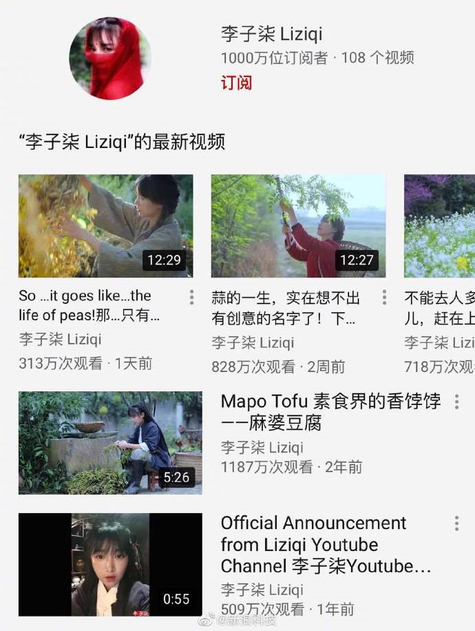 4月29日,@李子柒 在Youtube上的粉丝突破1000万,成为首个在该平台粉丝破千万的中文创作者。李子柒因传播美食与传统文化被大家熟悉,2017年8月起委托海外有资质运营商发布视频,其中播放量最多的是2019年春节发布的年货零食合集,观看量达5200多万。(新浪)