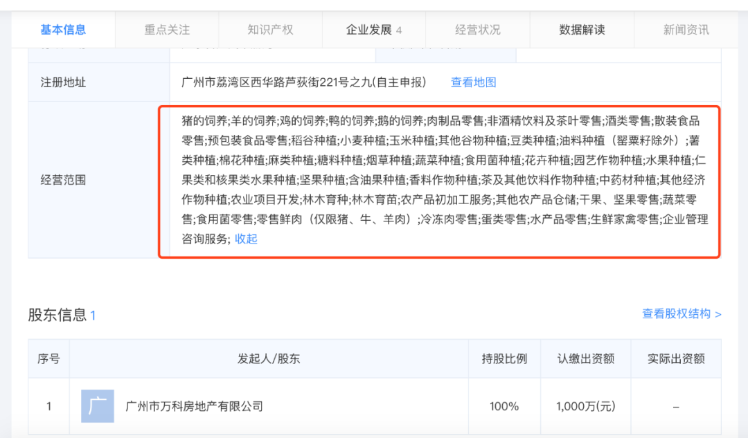 除此之外,万科还100%持股广州第六园农业发展公司(下称六园发展),这家公司经营范围包括:猪的饲养;羊的饲养;鸡的饲养;鸭的饲养;鹅的饲养……一家彻彻底底的养殖公司。