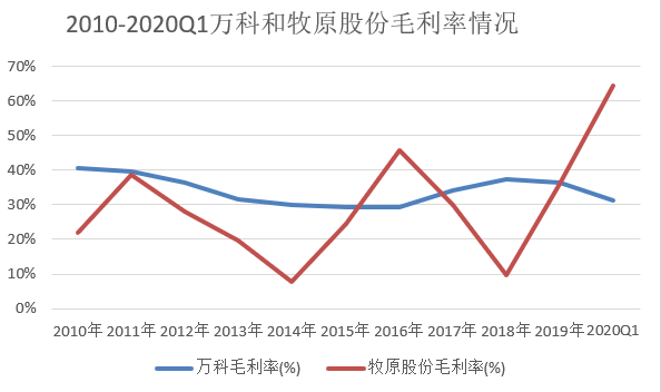 如果用万科的毛利率和净利率与猪养殖龙头牧原股份进行对比,除去2018年猪瘟流行的特殊情况,牧原股份的净利率远高于万科,2019年牧原股份的净利率达30%,是万科的2倍。
