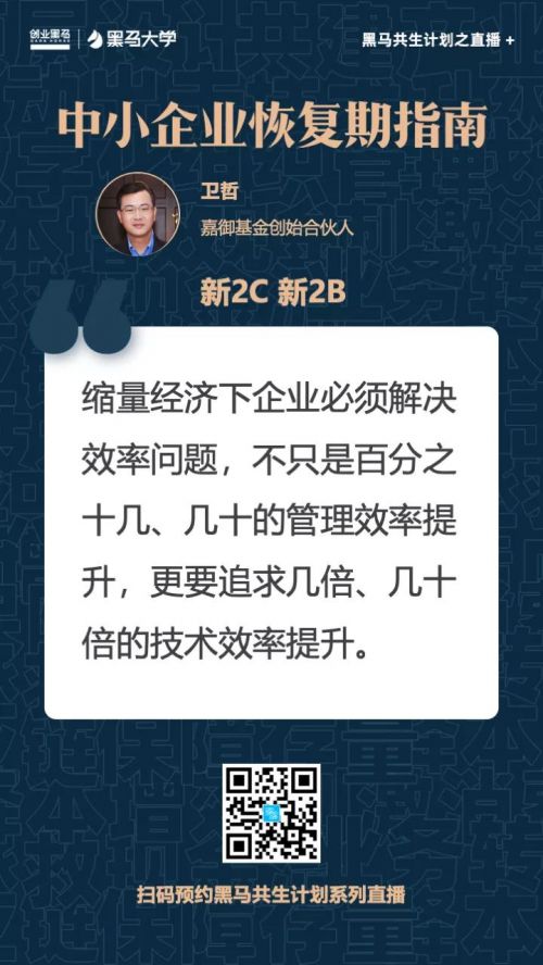 本轮直播也是黑马大学在线新产品“黑马共生会”的免费试听,共邀请了6位实战大咖担任主播。9日第二场直播嘉宾为黑马导师、嘉御基金创始合伙人卫哲,他通过在疫情期间的投资案例,分享了对于新To C和新To B的理解与建议。
