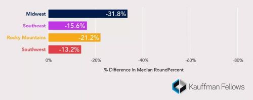 与由此产生的股权相比,太平洋和东北地区以外的地区在筹集的风险投资中位数上有较大的折扣。