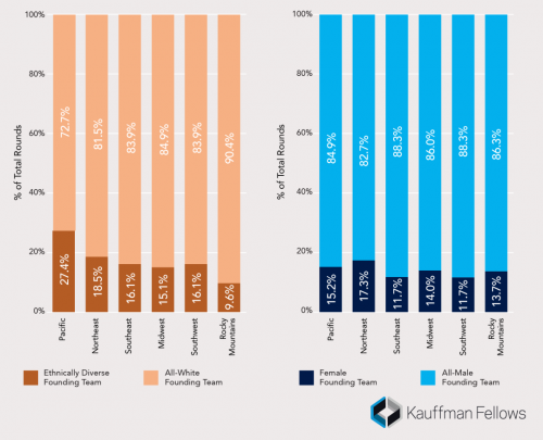 我们看到资金向纯男性创始团队(占早期风投融资总额的86%)和纯白人创始团队(占风投融资总额的73%)集中。