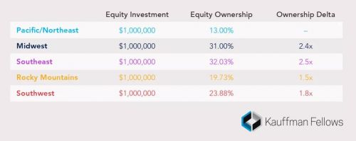 与太平洋地区和东北部地区相比,在东南部投资一美元,风险资本家的股权就会增加2.5倍。