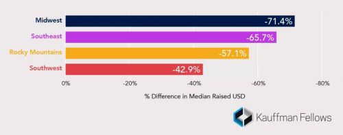 总的来说,太平洋和东北地区是投资大本营。非沿海地区筹集的风投资金只占一小部分:中西部(少71.4%)、东南部(少65.7%)、落基山脉(少57.1%)和西南部(少42.86%)。