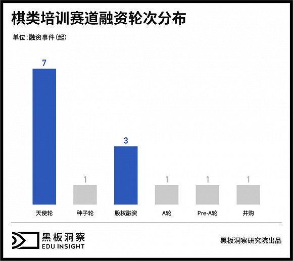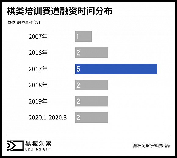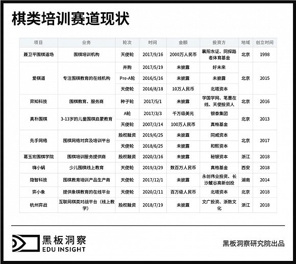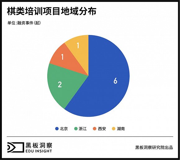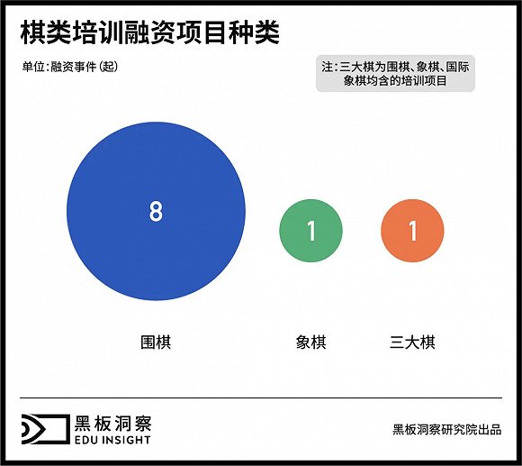 从融资时间上,我们可以看出,除2007年发生的一起天使轮融资外,其余融资事件都在2016年后发生,主要因为AlphaGo效应突出。到目前为止,有关于棋类的培训班种类有很多,但是真正可以吸引到融资的项目主要还是围棋。
