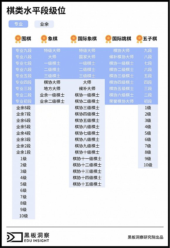 在围棋定段赛中,参赛选手年龄要求在25岁以下。在全国国际象棋少年冠军赛中,8岁组最高申请称号为棋协一级棋士,10岁组最高申请称号为棋协候补大师,12岁及以上组最高申请称号为棋协大师。象棋和国际象棋等级称号部分区分男女。大多数靠比赛名次或胜率获取相应等级。以国际象棋为例,据中国国际象棋协会统计数据显示,2010年全国大型国际象棋赛事有54起,2018年有114起,赛事数量翻倍。棋类运动流行趋势明显。