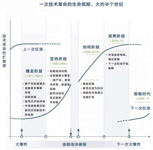 上图是以第五次科技革命为案例所展示的科技生命周期。周期大约持续了半个世纪,我们已经依次经历了爆发阶段(新产业爆发式增长,金融资本蜂拥而至),狂热阶段(全部集群大爆发,金融泡沫从狂热走向破裂),协同阶段(新范式成为共识,新技术应用的黄金时期),成熟阶段(市场增速明显放缓,进入存量博弈)。