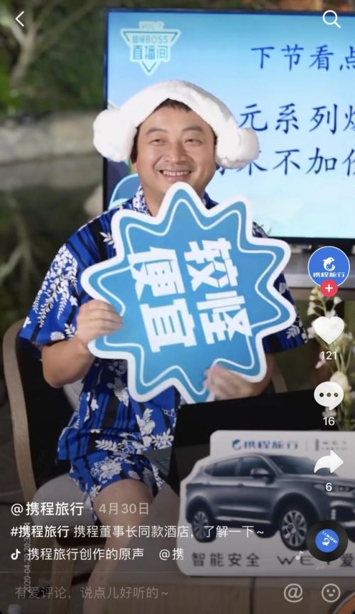 对,在这里我们暗戳戳提到的就是携程董事长梁建章先生了。目前,网上对他直播的讨论已经从最初的猜测携程是不是遇到极大困难了,演变到了如今猜测James宝宝(主持人给梁建章起的艺名)下次会cosplay个什么造型了。