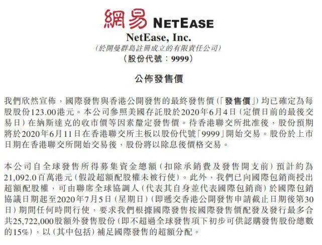 2020年6月7日 ,网易宣布,由国际发售和香港公开发售组成、共计新发行171,480,000股普通股的全球发售确定发售价。国际发售与香港公开发售的最终发售价均为每股发售股份123港元。网易最终发售价约合每股美国存托股397美元,与6月5日网易美股收盘价425.37美元相比,折价6.67%。对于这个折价,有经常打新的私募机构人士评价:“折价一般。”(新浪科技)