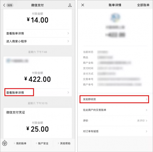 如果你们的聚餐是用微信支付的,那就更方便了。给完钱后直接点击“查看账单详情”,就可以发起群收款啦!