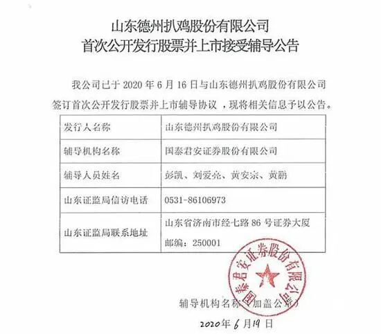 6月24日,山东证监局显示,山东德州扒鸡股份有限公司首次公开发行股票并上市接受辅导,辅导机构为国泰君安(17.360, 0.24, 1.40%)证券。