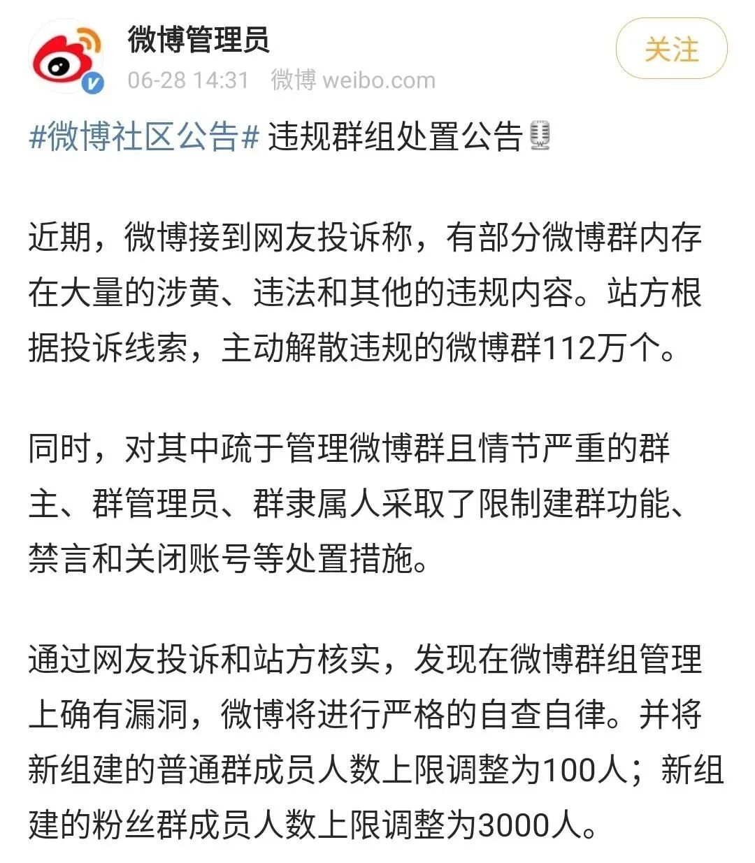微博管理员6月28日发布违规群组处置公告。公告称,近期,微博接到网友投诉称,有部分微博群内存在大量的涉黄、违法和其他的违规内容。站方根据投诉线索,主动解散违规的微博群112万个。同时,对其中疏于管理微博群且情节严重的群主、群管理员、群隶属人采取了限制建群功能、禁言和关闭账号等处置措施。(新浪微博)