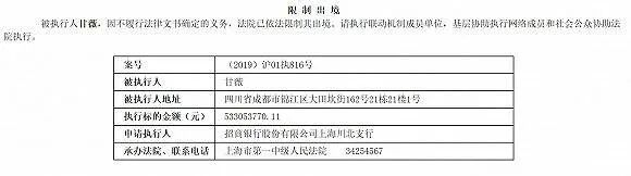 据报道,甘薇因不履行法律文书确定的义务,已被上海法院限制出境。法院文书显示,限制甘薇出境的申请人系招商银行上海川北支行,涉及执行金额5.3亿元。