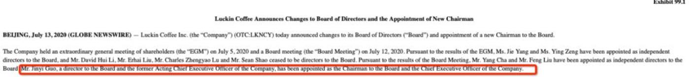退市宣告资本市场的死亡后,7月14日,瑞幸咖啡公布人事调整,任命郭谨一担任CEO和董事长,任命Ying Zeng和Jie Yang为独立董事,陆正耀、刘二海、黎辉、邵绍锋不再担任董事会成员。