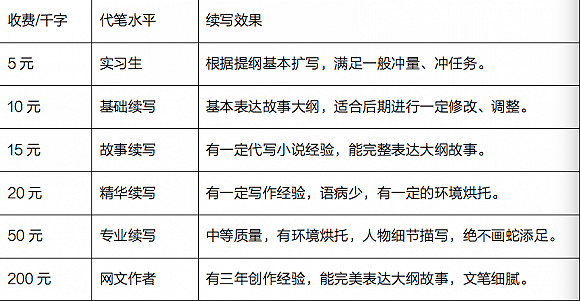 “但目前平台对于内容的要求越来越高,不走心的作品难被认可,而且成熟的读者也越来越精明了。”于此同时,逐渐壮大、规模化的代写,每千字收费的水平也在陆续走高,即便俗称的“小白文”、“爽文”,收费也在5~10/千字。