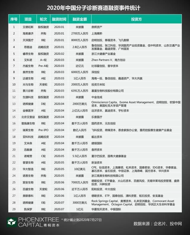 2020年1-7月,分子诊断赛道累计发生29起融资事件,占整个IVD赛道的70%。融资高潮主要发生在3、4月份,3月7起,4月8起。从融资金额来看,单笔融资额过亿的有9起,华大智造以10亿美元刷新国内基因测序最大单轮融资纪录。累计78家投资机构入场,其中启明创投3次出手,分别参与诺辉健康D、E轮,和天深医疗B轮融资。