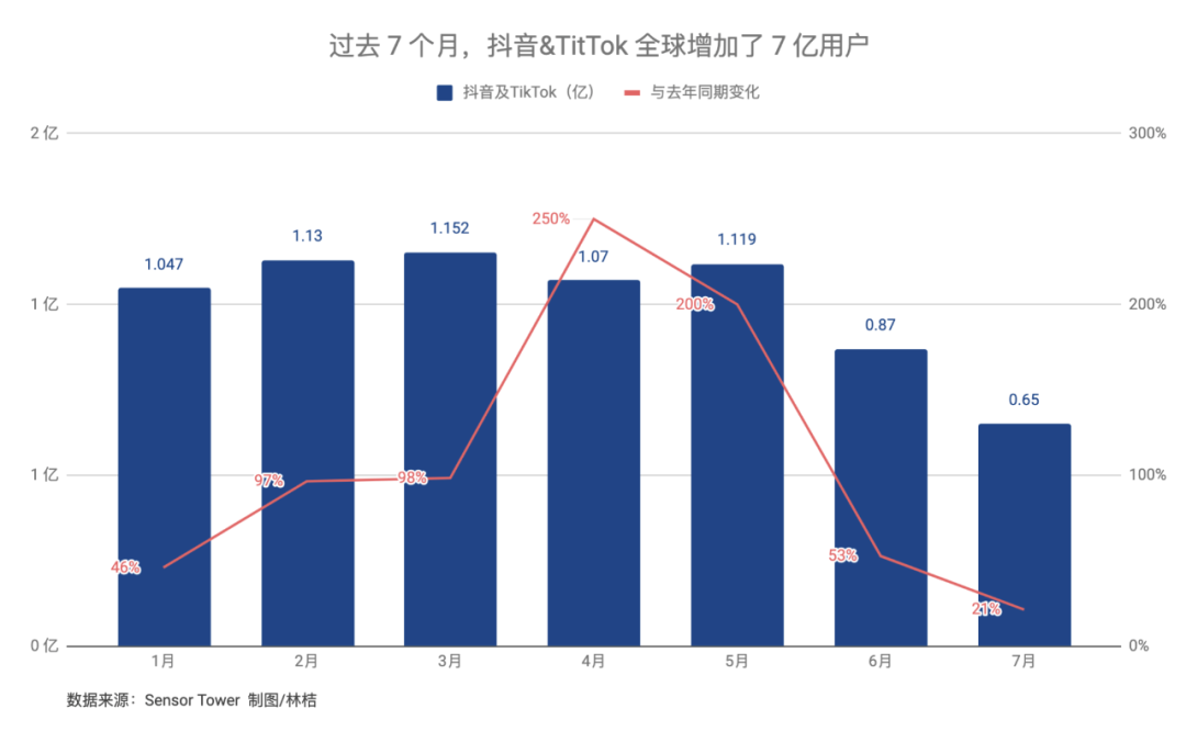 Sensor Tower的数据显示,抖音和TikTok在全球App Store和GooglePlay的总下载量突破21.5亿次。其中7亿是今年年内完成的。按照这个增速,抖音和TikTok今年的发展更势如破竹。