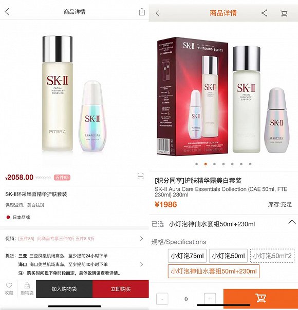 SK-ll环采臻皙精华护肤套装价格对比;左 / cdf离岛免税 右 / 日上